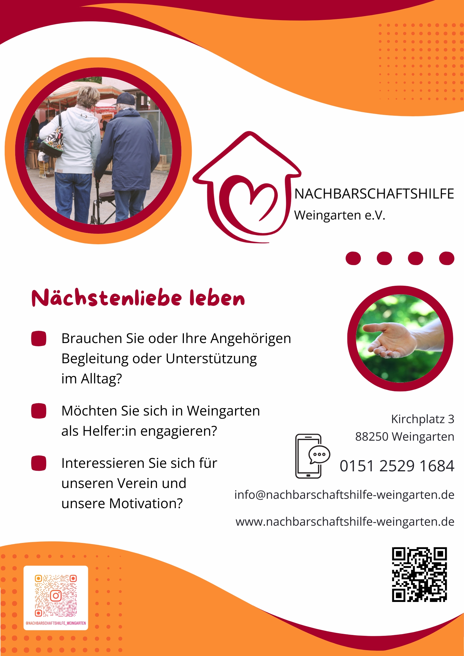 Nach Gründung des Vereins am 5.11.2025 sind wir bemüht, möglichst schnell Angebote für die Nachbarschaftshilfe in Weingarten zu machen. Bis der Verein aktiv Hilfe anbieten kann, unterstützt uns die Organisierte Nachbarschaftshilfe der Caritas Bodensee-Oberschwaben. Haben Sie Fragen? Dann melden Sie sich gerne bei uns!